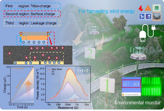 摩擦纳米发电机(TENG)作为新型能量转换装置,能高效将风能、机械能等环境能量转化为电能,但其表面电荷易消散、体积效应引发的电荷泄漏问题,导致输出性能与耐久性难以兼顾,严重制约实际应用。对此,研究团队创新性提出“多区域电荷捕获”策略,开发出耐用型双输出模式TENG(DDO-TENG)。为解决传统TENG表面电荷消散、泄漏导致的能量浪费及耐久性不足等关键难题提供新方案。