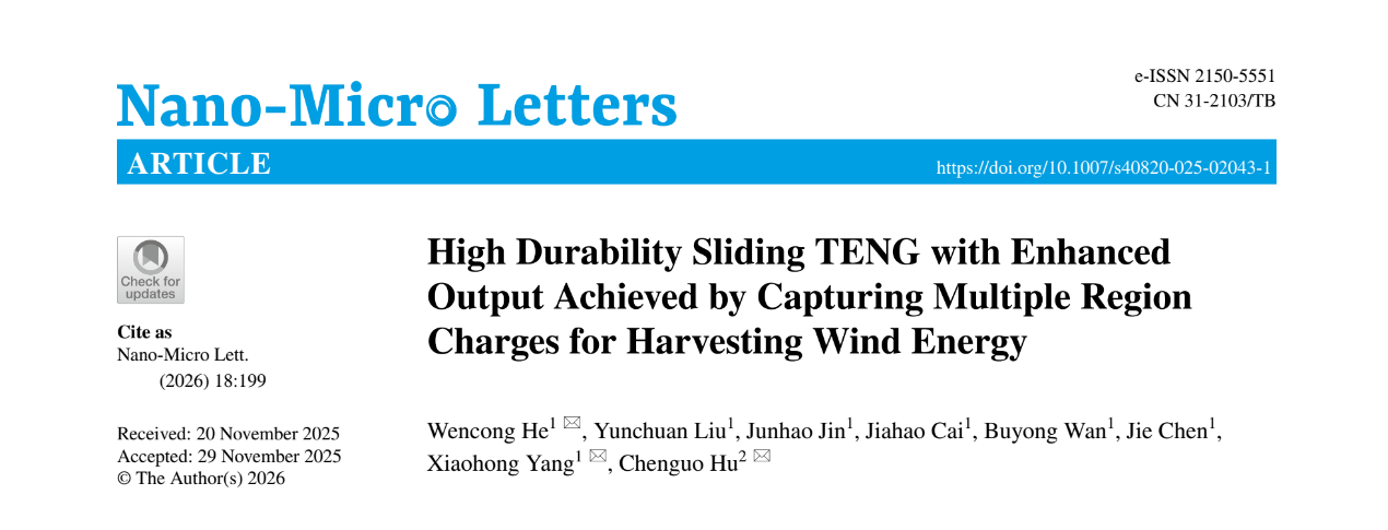信息材料物理与器件课题组在国际期刊《Nano-Micro Letters》(中科院一区TOP,影响因子30.1)上发表题为“High Durability Sliding TENG with Enhanced Output Achieved by Capturing Multiple Region Charges for Harvesting Wind Energy”的研究论文,重庆师范大学为论文第一完成单位,青年教师贺文聪博士为论文第一作者兼通讯作者,杨晓红教授、重庆大学胡陈果教授为共同通讯作者,参与研究的还有研究生刘云川、金俊豪、蔡家豪、万步勇副教授和陈杰副教授。